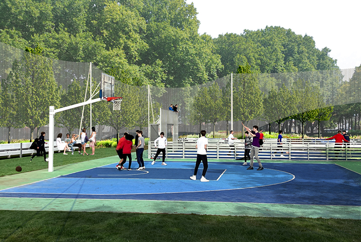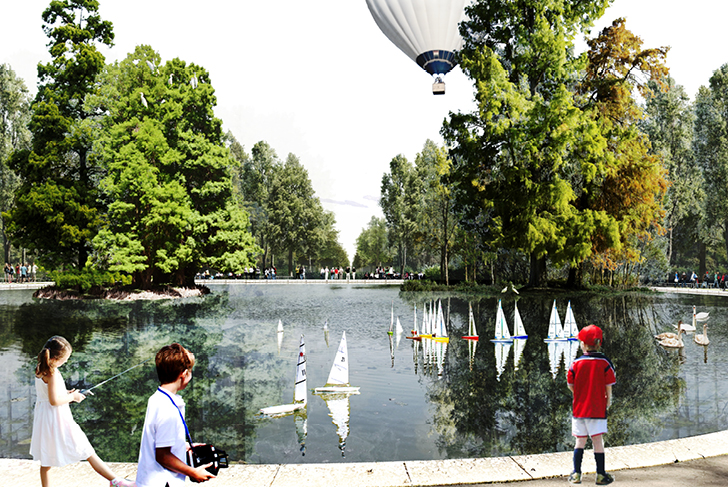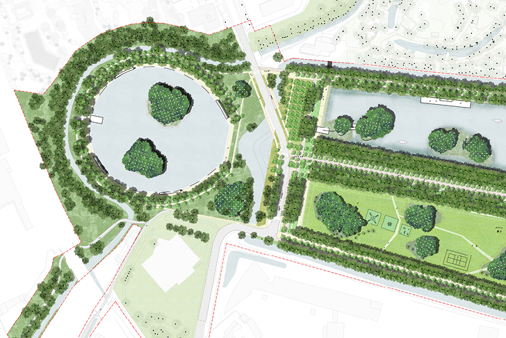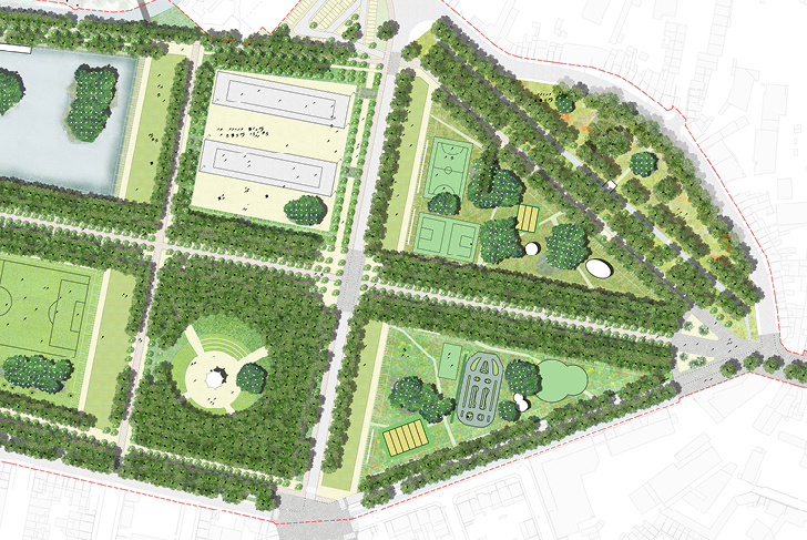 Footpaths and bike paths center active transportation. The wide range of activities is joined by lightweight and elegant park furnishings, including docks and bridges over the ponds, various bench styles along or among the greenery, gazebos, and nets for sports.