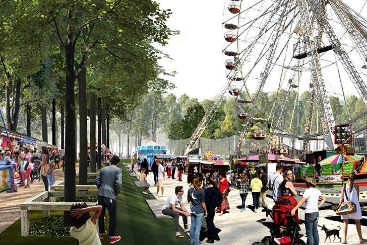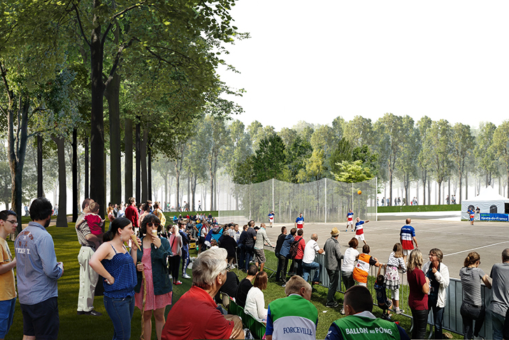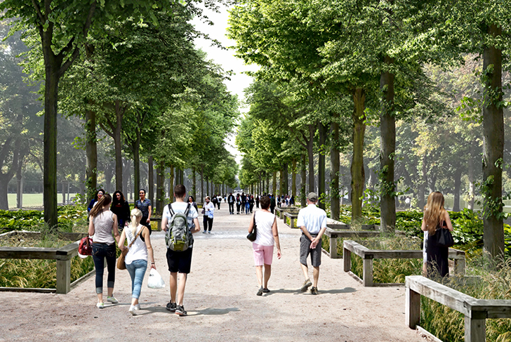 The park’s tree system, mishandled during previous redesigns, needs to be strengthened and expanded. 870 trees of new species (maple, oak, elm, or hackberry) planted in rows strengthen, expand, and diversify the existing rows of trees. This narrows the pathway and view along the Promenade de la Hotoie, reframing vistas out to the city.