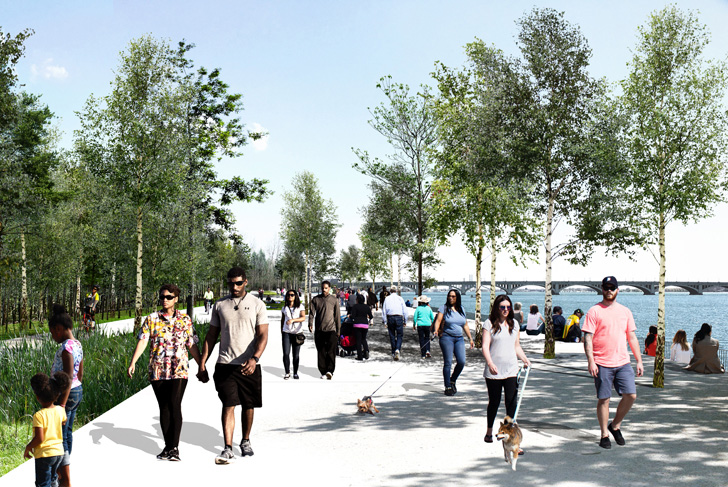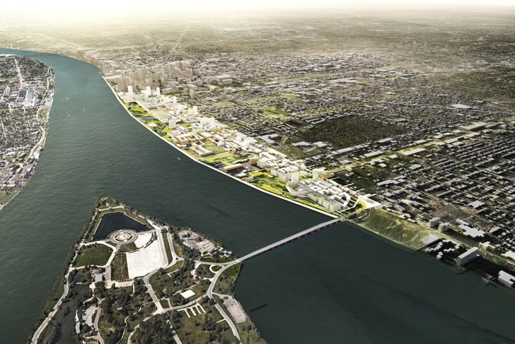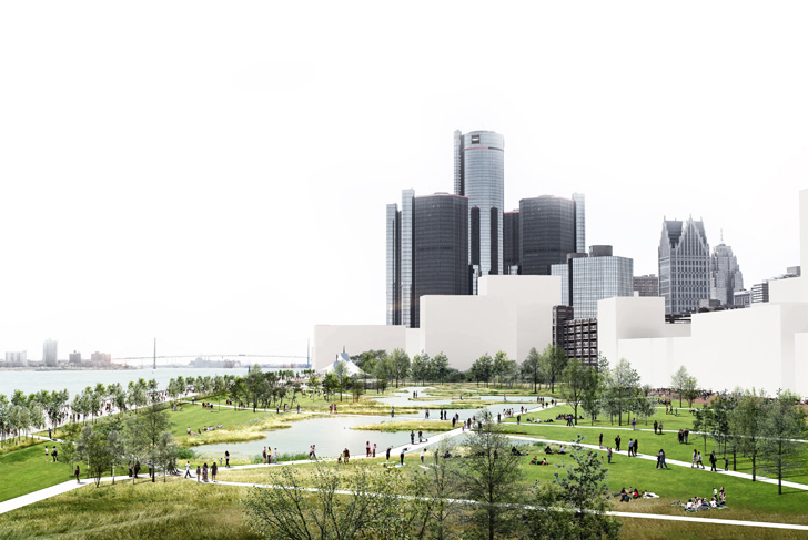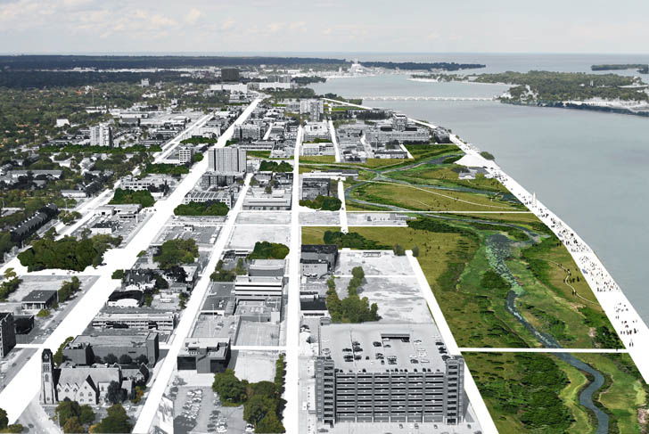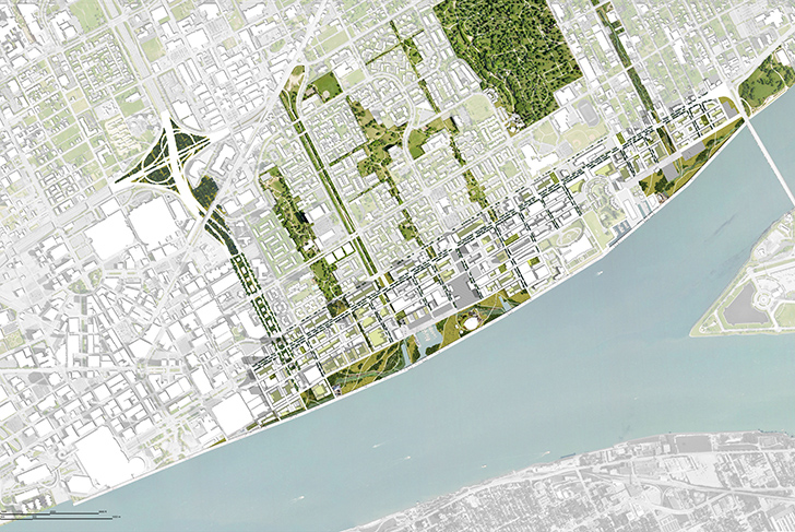 We believe that we can adopt this vision for Detroit’s East Riverfront project. With a sort of amplified geography, an extraordinary landscape will assist in realizing all infrastructural components, main roads, parkways, and water management means, and potentially allow for management of contaminated soil.