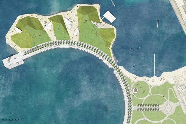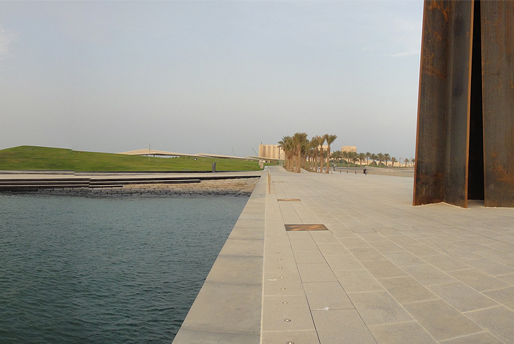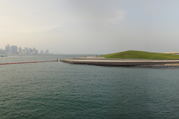 The park for Doha's Museum of Islamic Art adjoins the emblematic cultural edifice designed by I.M. Pei on the waterfront. The park, a fourteen-hectare public space positioned along an extension over the sea, is situated near the port at the southern extremity of Doha bay, on the other side of a small, currently existing cliff facing the museum.