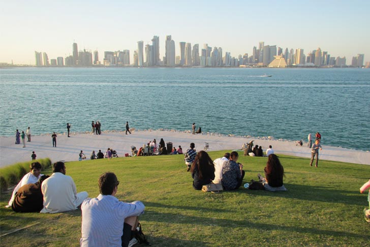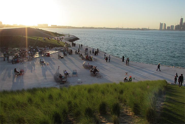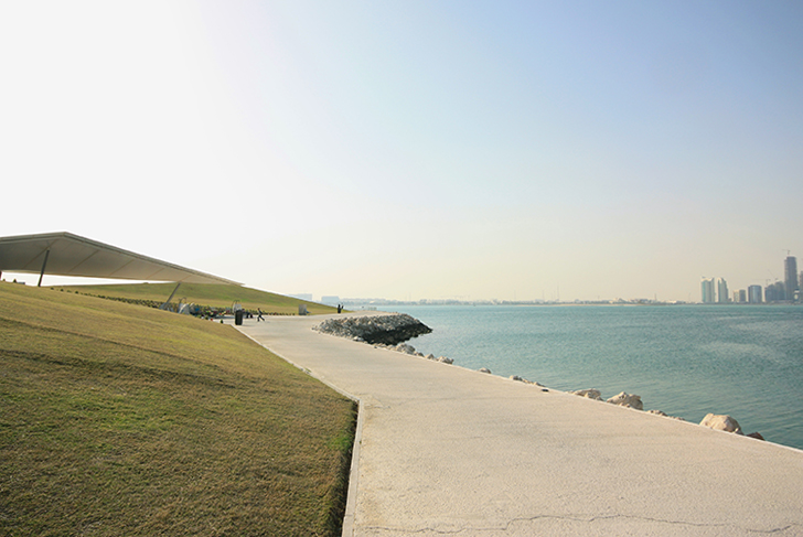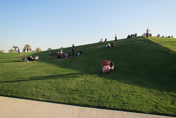 In contrast to a formal treatment of the small cliff and its alignments of palm trees, the project created vast green slopes stripped of any decorative pattern. These slopes rise gradually towards the horizon. Their gentle incline discretely guides walkers up to an overhanging ridge, facing Doha bay.