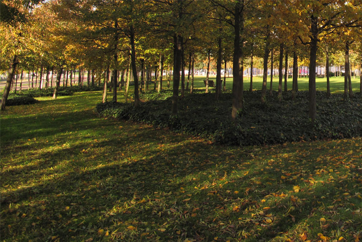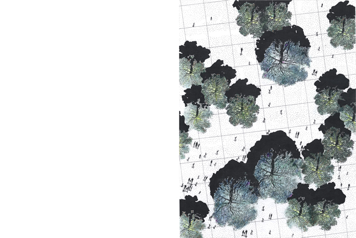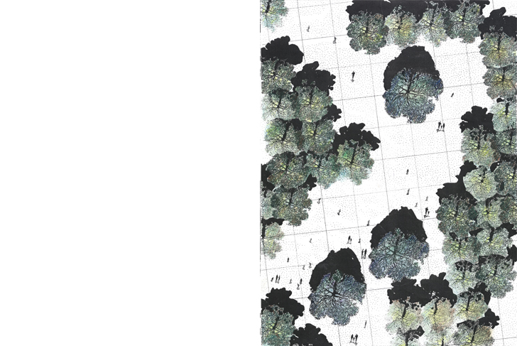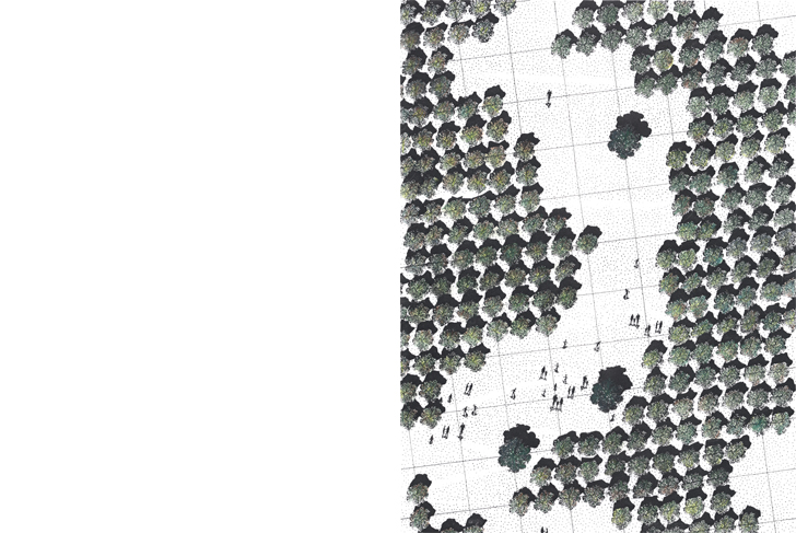 The site in its totality is organized with a framework that sculpts out clearings, and separates the trees which have yet to reach maturity. This pattern is based not on a hierarchy in design, nor on an aesthetic whim, but solely on the rules of planting.