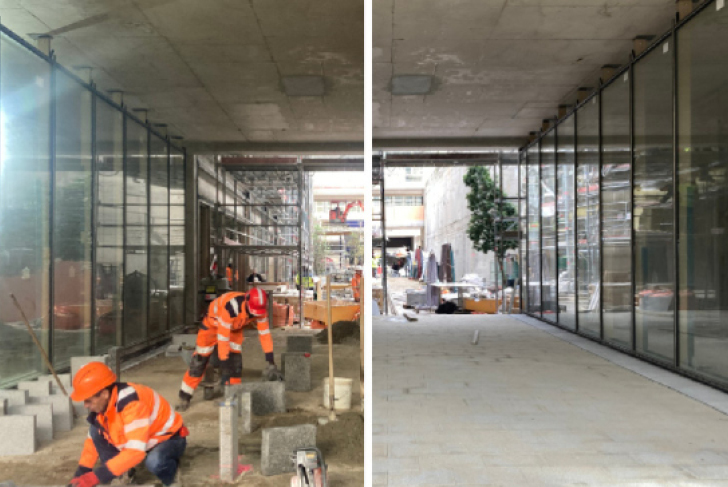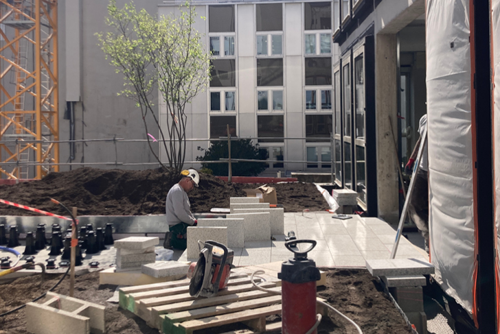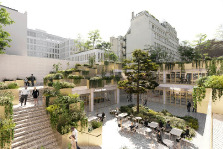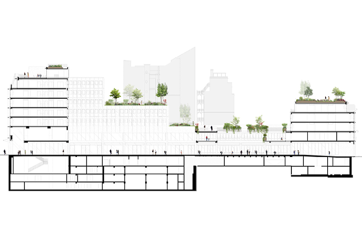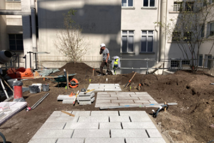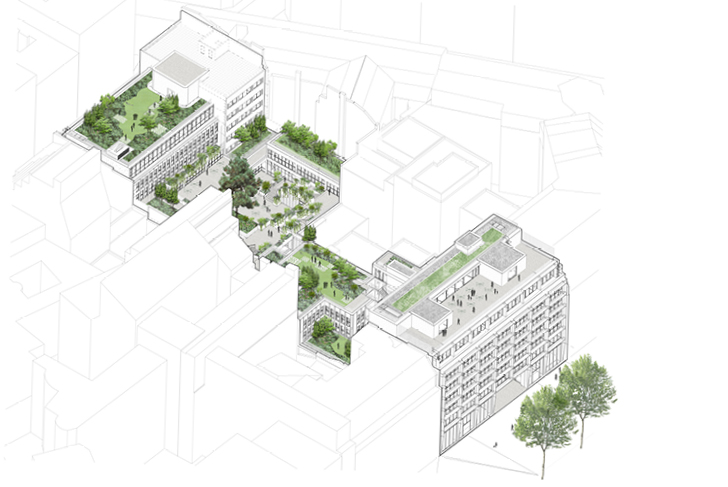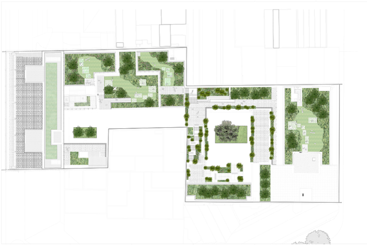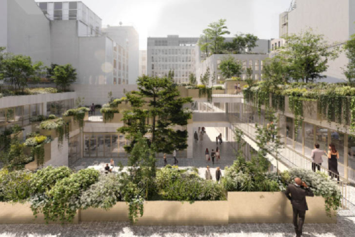 La traversée piétonne de l'îlot est séquencée par des espaces couverts ou à ciel ouvert. Son sol en dalle de granit, comme pour l'ensemble des terrasses et des emmarchements, inscrit le projet dans son contexte parisien. Les constructions sur dalle limitant l'apport en terre végétale, les contraintes techniques sont ici déterminantes. Un substrat allégé est mis en place et modelé afin d’offrir des épaisseurs suffisantes en fonction des végétaux plantés.