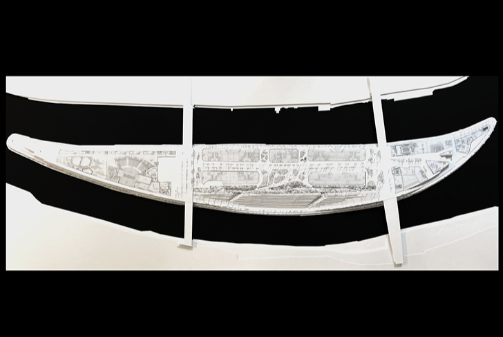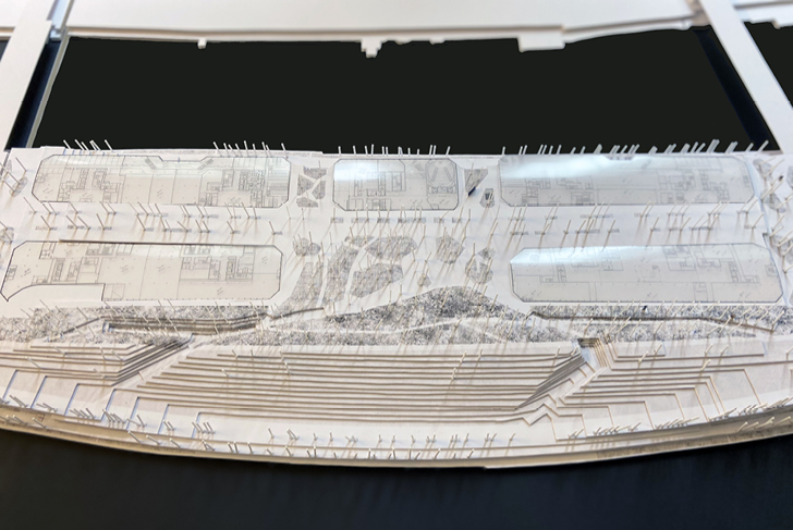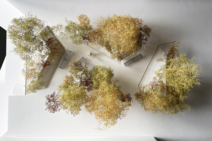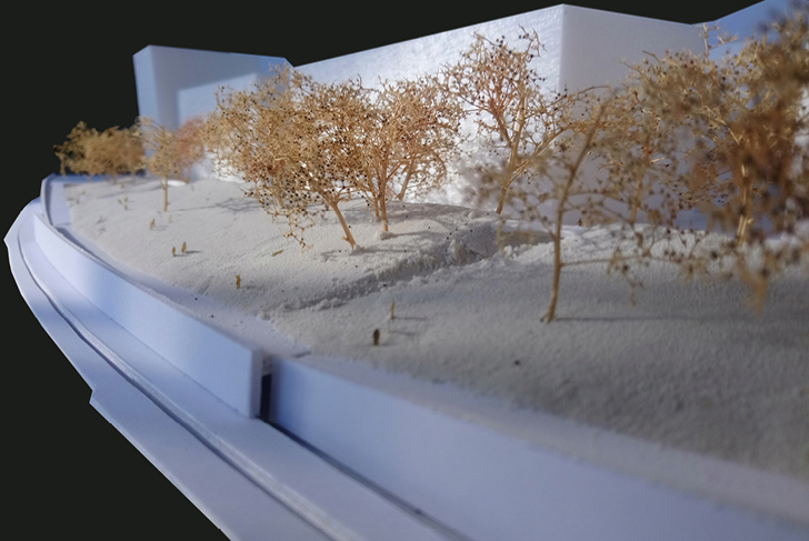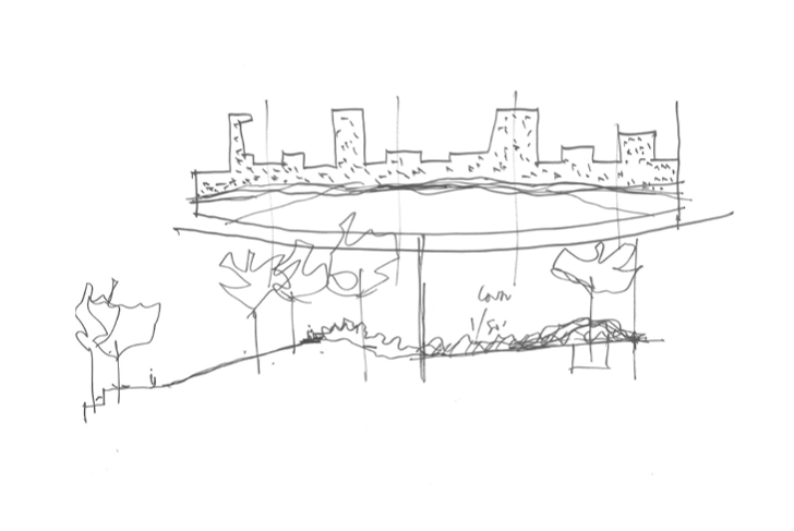Dans la forte pente de la pelouse sont sculptés deux canyons invisibles en perspective. Des passerelles enjambent ces chemins en creux, de faible dénivelé, qui relient le quartier et la berge.
