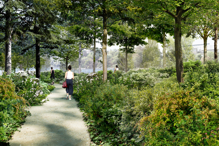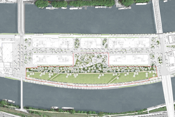 Trois missions conjuguées : Création d’un très grand parc de 2,4 hectares - Réalisation des espaces publics - Aménagement des espaces extérieurs de la Fondation Emerige (pointe amont)