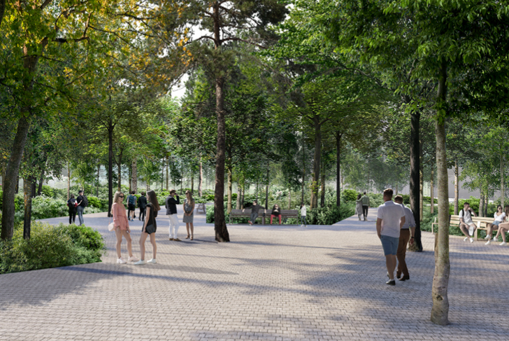 Le parc relie également les deux esplanades en contact avec les pointes, de part et d’autre du nouveau quartier. Ces espaces publics évoluent vers une typologie nouvelle de places-jardins, évoquant les cœurs de campus américain. Ces places-jardins conjuguent les usages intenses de la place (Fondation Emerige et Seine Musicale sur les pointes) à une très forte présence végétale.
