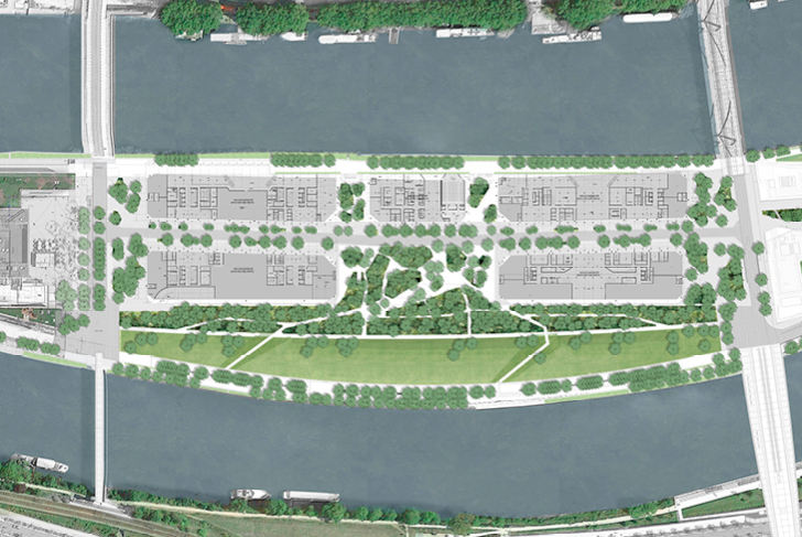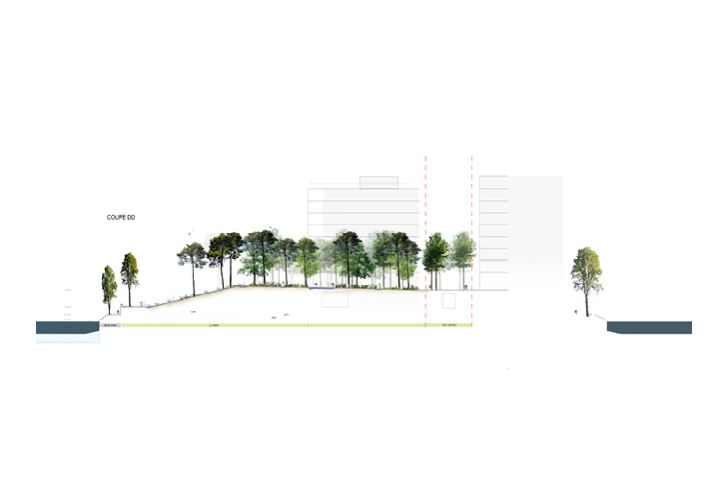 Le parc, les deux esplanades, les espaces publics du nouveau quartier et la pointe Amont sont l’occasion de créer un foisonnement d’espaces extérieurs de typologie nouvelle dans un continuum paysager inespéré.