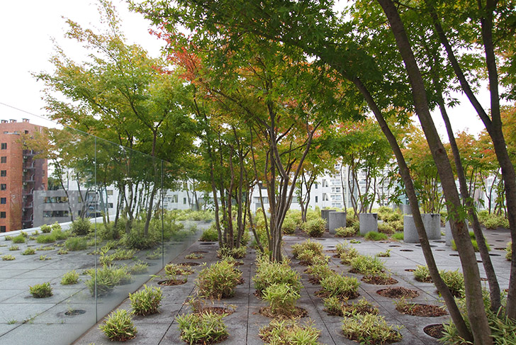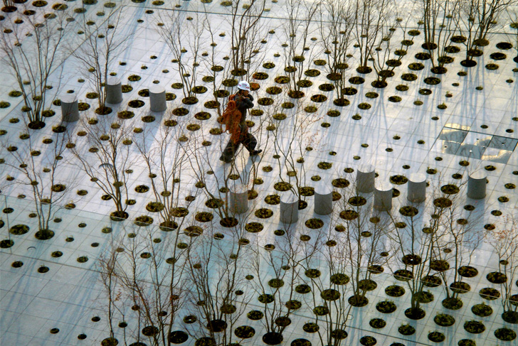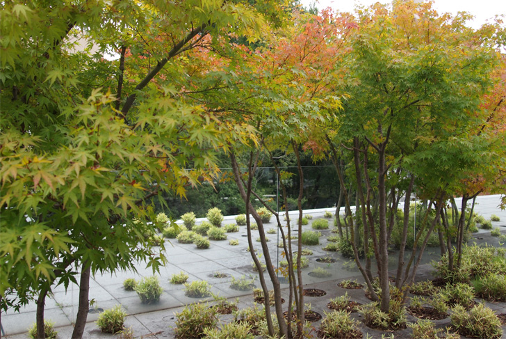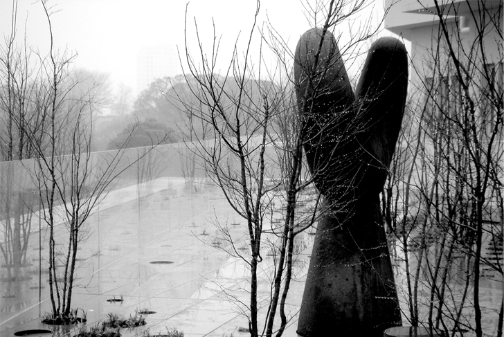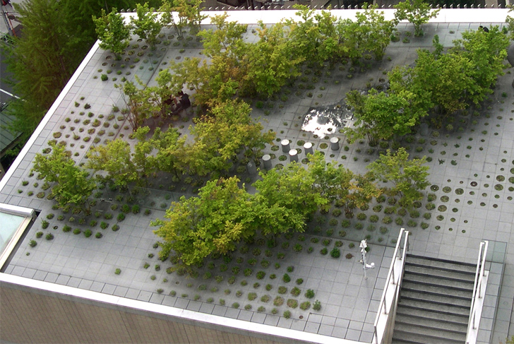 The visitor arrives thus at a garden in the shape of large slabs perforated by tall grasses and trees: a shape of nature belonging to the data-processing artifice, where Noguchi used the plastic artifice. This space is not composed of solids and voids, but of successive plans and passages with variable densities, in which one can involve oneself. The overall shape does not correspond to any clearly identifiable geometrical proposal. The location of the railing, placed very inside the roof, blurs still a little more the limits. The garden continues to develop behind this line, but the visitor doesn’t perceive any more the real invested surface. From these diffuse heights, his view extends on the city and the sky, without passing by the foreground.