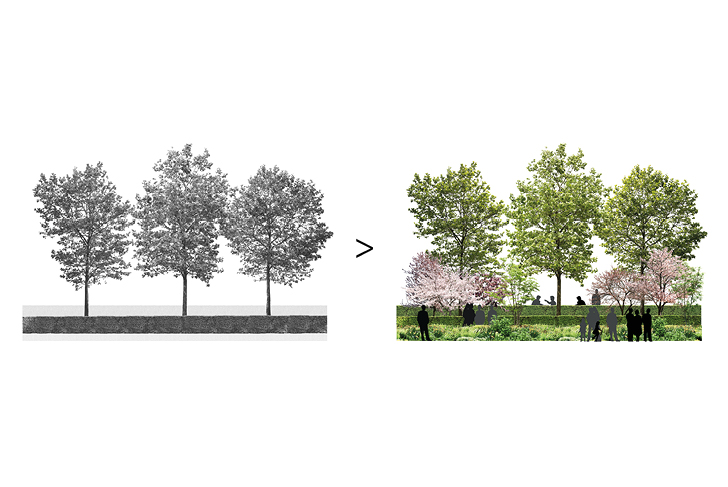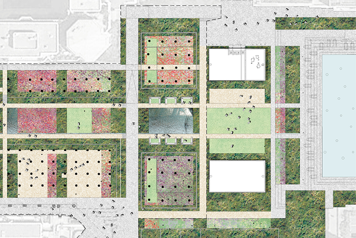 - L’introduction d’une diversité végétale sur la dalle. Le projet prend le parti d’une renaturation ambitieuse, et opère une inversion de la distribution actuelle entre surfaces minérales et végétales. 70 % du périmètre d’intervention est végétalisé et perméable, 30 % est conservé en surface minérale pour les déambulations piétonnes. Le patrimoine arboré existant est préservé. La renaturation passe par l’introduction de masses arbustives et de carrés fleuris qui répondent à des objectifs écologiques et de confort d’usages.