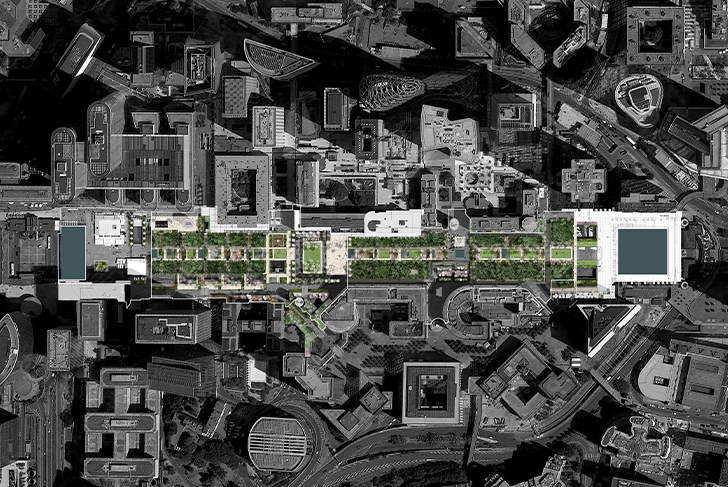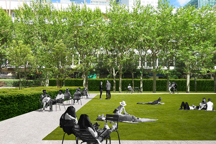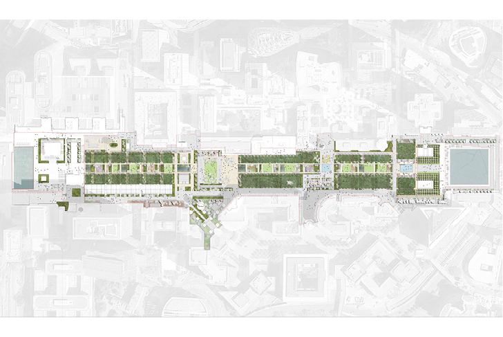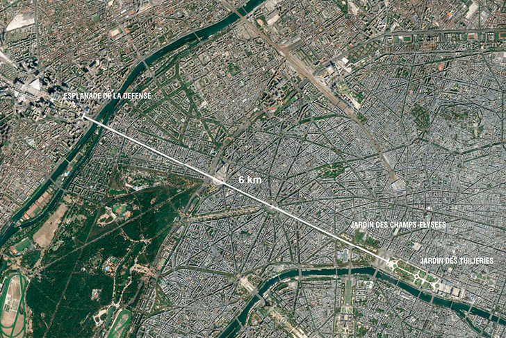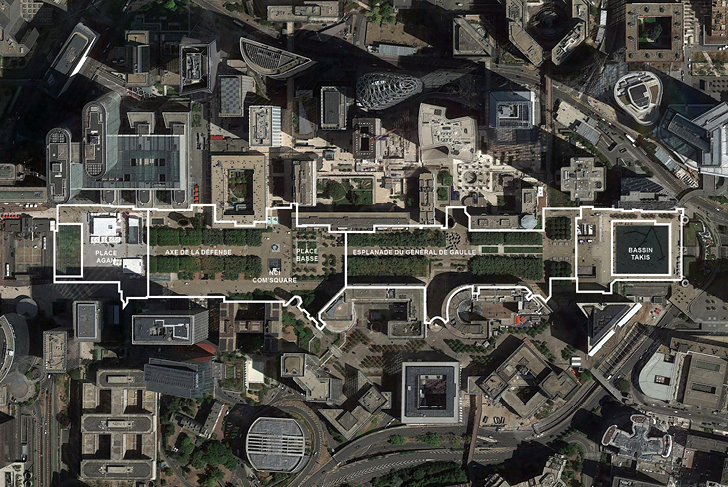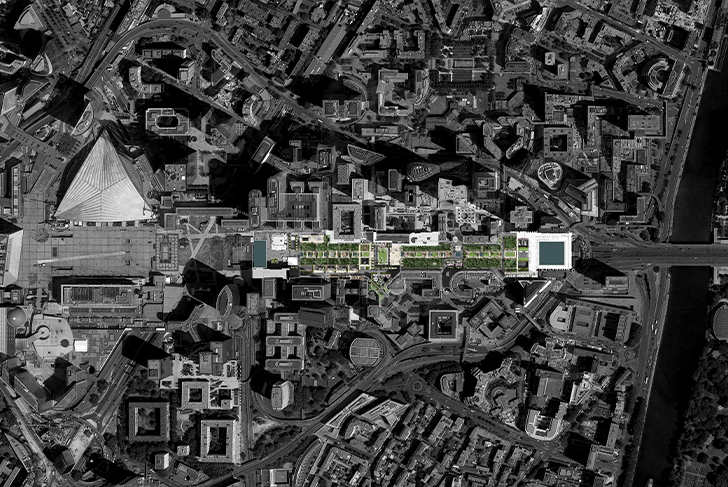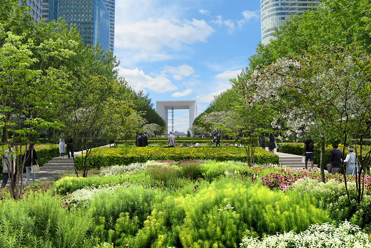 Dans la perspective de l'axe historique tracé par le Nôtre, le projet transforme l’Esplanade de la Défense en un vaste parc et complète ainsi une séquence de jardins parisiens emblématiques (les Tuileries, les jardins des Champs Elysées). Il joue avec les tracés imaginés dans les années 70’ par le paysagiste américain Dan Kiley afin d’adapter cet espace public monumental aux mutations récentes des quartiers de la Défense (mixité croissante en faveur du résidentiel, ambitions de gestions écologiques et de diversification des pratiques des espaces publics, développement des déplacements doux, mise aux normes PMR…).