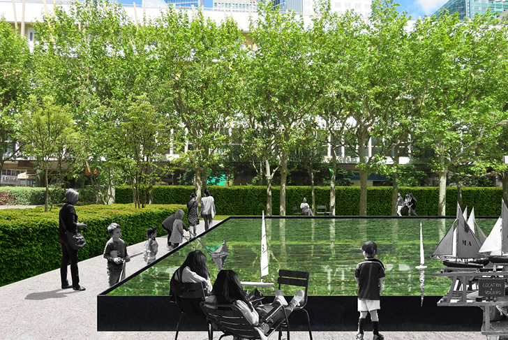 Un dispositif de fontainerie anime et accroit le confort du parc en période estivale. Des pièces d’eau transversales sont positionnées à chaque palier, en amont des différentes séquences paysagères. Elles sont reliées entre elles par de discrets canaux qui accompagnent les cheminements piétons. Cette irrigation s’inspire des projets de Dan Kiley et participe à inscrire le parc dans la logique des pièces d’eau ponctuant la Défense. Les bassins successifs mettent en scène les chambres de verdure, leur apporte de la fraîcheur ainsi qu’une ambiance sonore diffuse, prolongeant le récit entre les fontaines Agam et Takis.