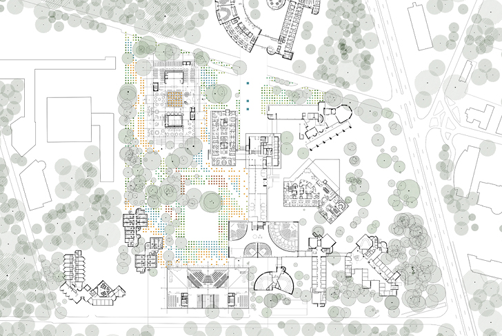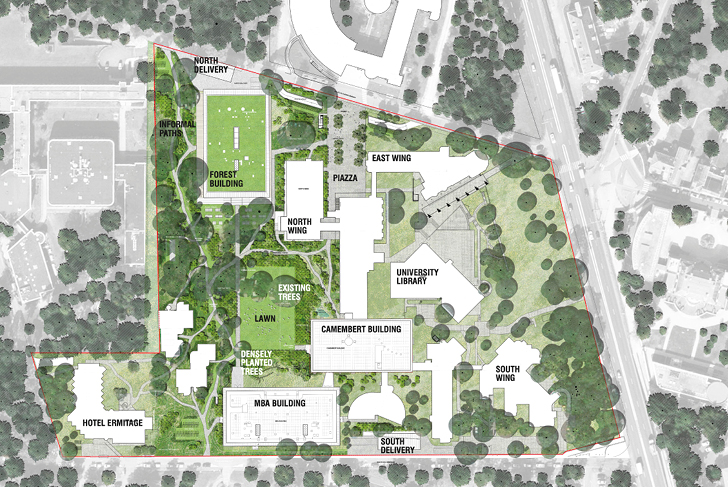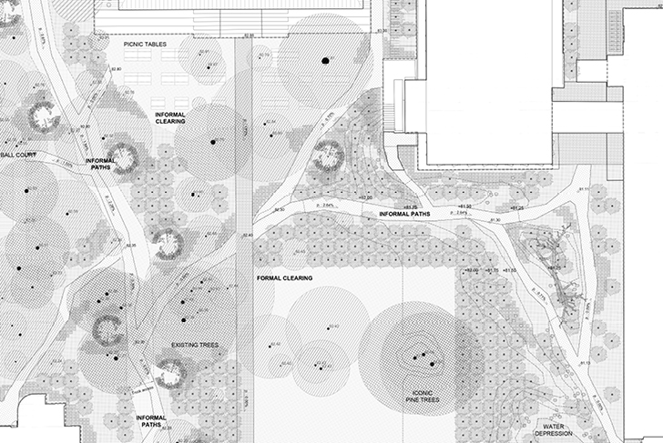 Notre projet d’aménagement, en collaboration avec les architectes HdM, est de créer un parc dans lequel les bâtiments seraient venus s’installer, s’incorporer. Celui-ci, composé avec la végétation indigène, propose une miniaturisation, une transposition de la forêt environnante à l’échelle du campus.