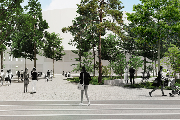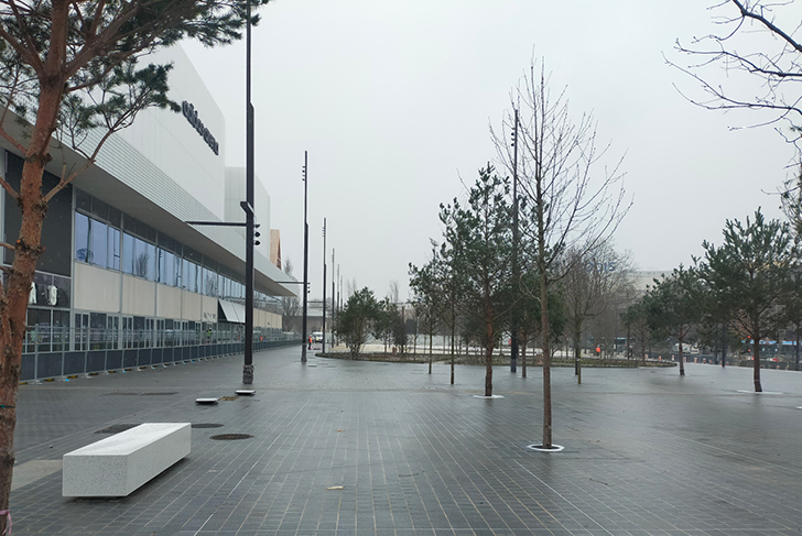 L’aménagement du parvis de l’Arena, équipement olympique d’envergure pour 2024, lance la transformation du quartier de la Chapelle et en dévoile les ambitions urbaines, paysagères et écologiques. Il est abrité de façon diffuse par une canopée de pins, assurant une présence végétale continue au fil des saisons. Les pavés, qui le composent, rappellent son identité parisienne. Ses joints enherbés, dans les zones de moindre flux, rendent, dès que possible, le sol perméable. Ce parvis inaugure les futures promenades plantées du quartier qui seront autant d’îlots de fraicheur.