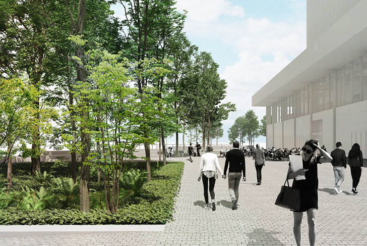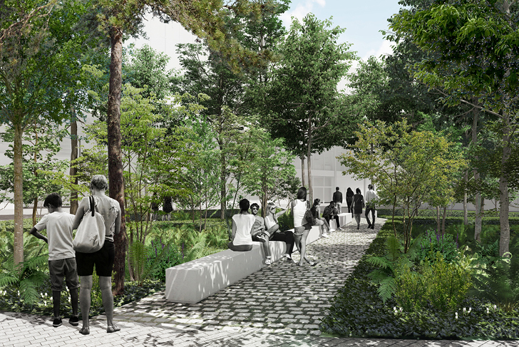 Le long du périphérique est planté un corridor boisé qui répond au temps long de l’aménagement urbain. Initialement barrière contre les nuisances de cette infrastructure, ce boisement évolue et s’ouvre en corrélation avec le futur apaisement du trafic. Une promenade et des allées densément végétalisées relient les principaux espaces publics de la ZAC. Une alternance de cours et de bosquets prend place dans la cité Charles Hermite et deux jardins en miroir sont dessinés : celui du square Charles Hermite et le parvis de l’Arena.