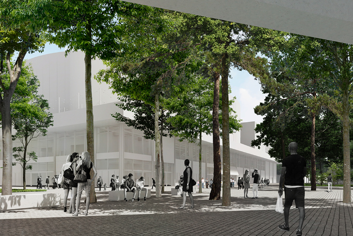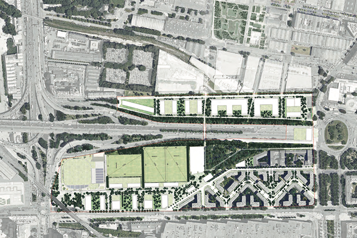 Les alignements d’arbres sur le boulevard des Maréchaux et ceux, plus clairsemés, longeant le boulevard périphérique fournissent l’armature paysagère dans laquelle nous nous inscrivons en créant des continuités paysagères boisées. La recomposition du bâti se fait au profit d’un grand vide unitaire constitué de nombreux terrains de sport du quartier et de nouveaux aménagements paysagers.
