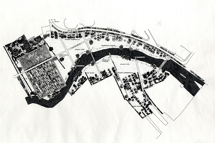 La commune d’Issoudun a préempté un ensemble de petites parcelles inondables le long de la Théols en centre-ville. Nous sommes en charge de leur transformation en parc public. Le dessin du parcellaire est médiéval. Malgré l’extrême dégradation du site, nous sommes sensibles à l’histoire du travail de cette terre horticole. Nous imaginons un processus de substitution de ces traces horticoles : tout reste en place mais tout change de nature. Des haies remplacent les clôtures, des parterres de fleurs succèdent aux planches des potagers abandonnés, des vergers ornementaux et des prairies fleuries remplacent les friches. Le sol reste intact. L’ensemble est accessible au public qui, très vite, trouve ses repères dans ce parc où tout est nouveau mais où tout semble familier.