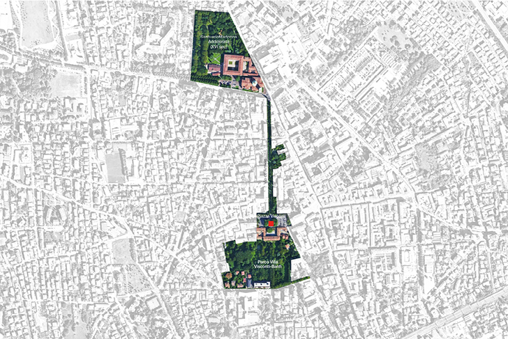 La place Visconti se situe dans la commune de Rho, ville satellite de la banlieue de Milan. Malgré sa taille considérable de 12 000m2, son riche patrimoine architectural et arboré, cette place, dédiée à la voiture, fragmentée et mal raccordée à l’animation des rues du centre, apparaît comme un espace urbain de seconde zone, peu investi par les piétons.