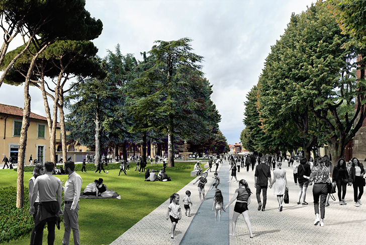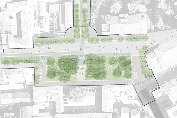 La Via Edmondo De Amicis, ouverture de la place vers le nord,est transformée en allée-jardin selon un nouveau profil de rue unifiée, plantée, constituée de deux allées piétonnes latérales installées de part et d’autre d’une grande allée circulable.