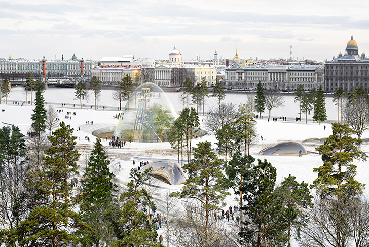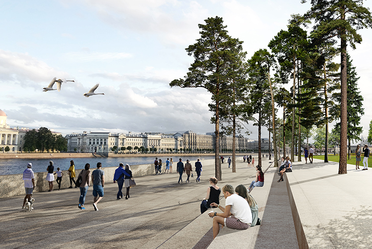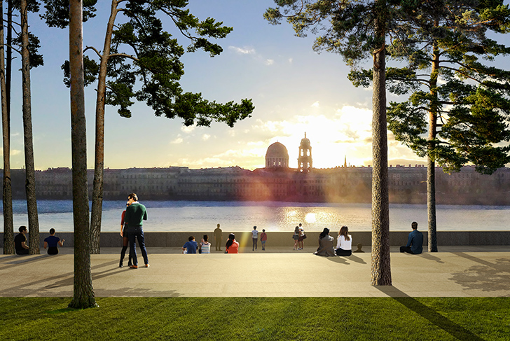 Le parc a la forme d'une clairière qui s'ouvre sur la rive dans le but de magnifier les vues à la fois sur le fleuve et sur l'extraordinaire paysage de la ville, marqué par la grandeur de la façade historique de Saint-Pétersbourg.